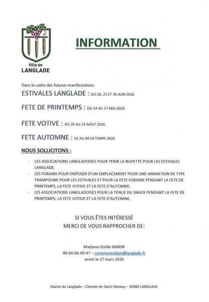 La commune de Langlade sollicite les associations langladoises et les forains pour certaines des manifestations organisées en 2026.