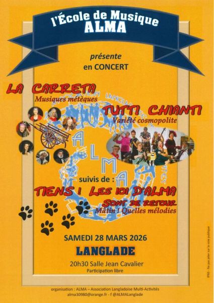 L'école de musique Alma vous propose une soirée musicale le samedi 28 mars 2026 à partir de 20h30 à la salle socio-culturelle.